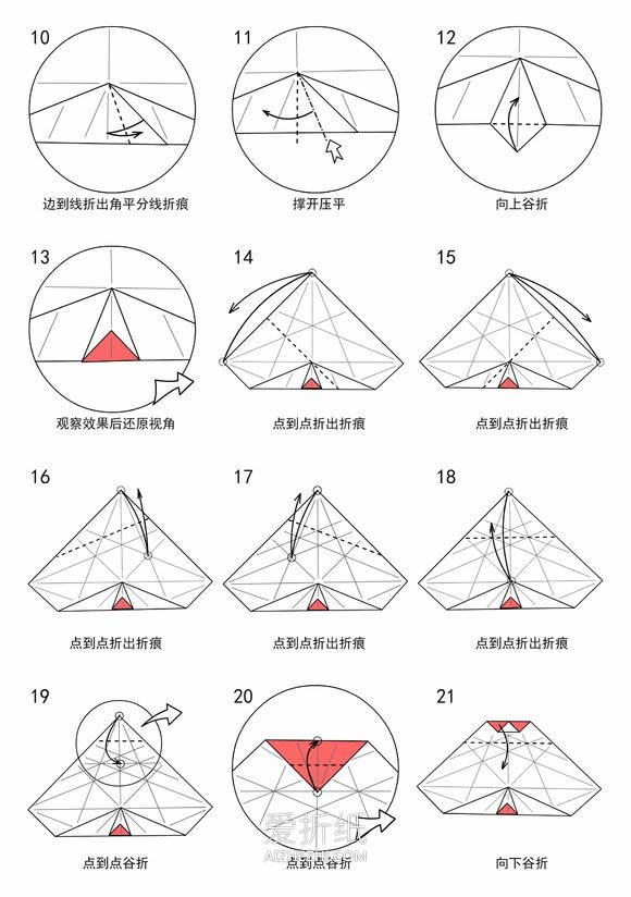 折纸翅膀心的步骤图二。重点讲下步骤27:这是两个联动的撑开压平操作,也可以说是两个旋转折叠,本质是一样的,按照折线折自然就会出来,如果不确信怎么折,可以大胆一点尝试,另外就是要对照下一步效果。还有步骤28:只要把多出来的三角片藏到里面就行了,其实这步直接不做也不影响。