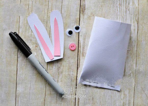 接着用白色和粉色卡纸做出长长的耳朵,并另外准备活动眼珠、纽扣、马克笔。